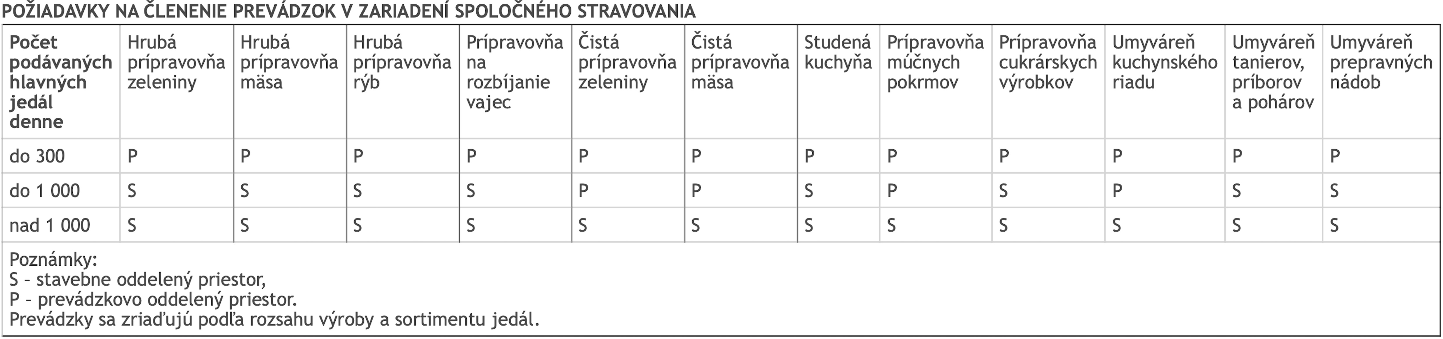 “Priestorové usporiadanie a vnútorné členenie zariadenia spoločného stravovania musí vytvárať podmienky na čistenie a dezinfekciu, zabránenie hromadeniu nečistoty, styku s toxickými materiálmi, vytváraniu kondenzačnej vody a rastu plesní na povrchoch”